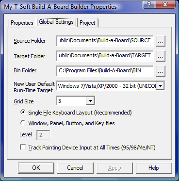 Target Folder - Location of Target files for all Panels. Any Builds will be created here under the name of the Project (Panel), then the Target System subfolder. A "Test" set of files (Windows Win32 platform) will be location in the Project (Panel) folder, so you can view the Build results immediately (Build | Execute).