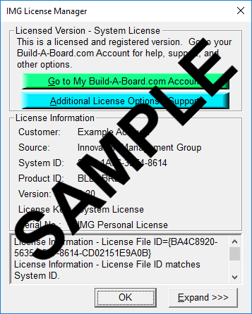 The IMG License Manager will operate with an IMG Personal License (Basic/Standard/Professional). This is a system based license that can license any supported IMG product per platform. Licensing is done through the internet and your Build-A-Board.com account, accessed via the "Retrieve System License" button.
