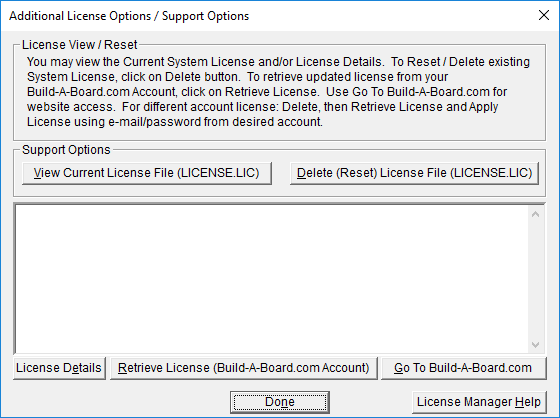 Use "Retrieve License (Build-A-Board.com Account)" to reload and obtain the current license from your Build-A-Board.com account. This could be necessary if you've added a platform license, purchased a license while operating on an evaluation license, added a serial number and been advised to renew your license, or other license change that requires a refresh/renew from the current license available tied to the current Build-A-Board.com account. Note that if you need a license from a different Build-A-Board.com account, you must Delete / Reset the license, and Apply the license to the current system with your e-mail/password from the correct Build-A-Board.com account.
