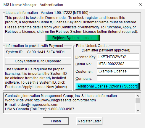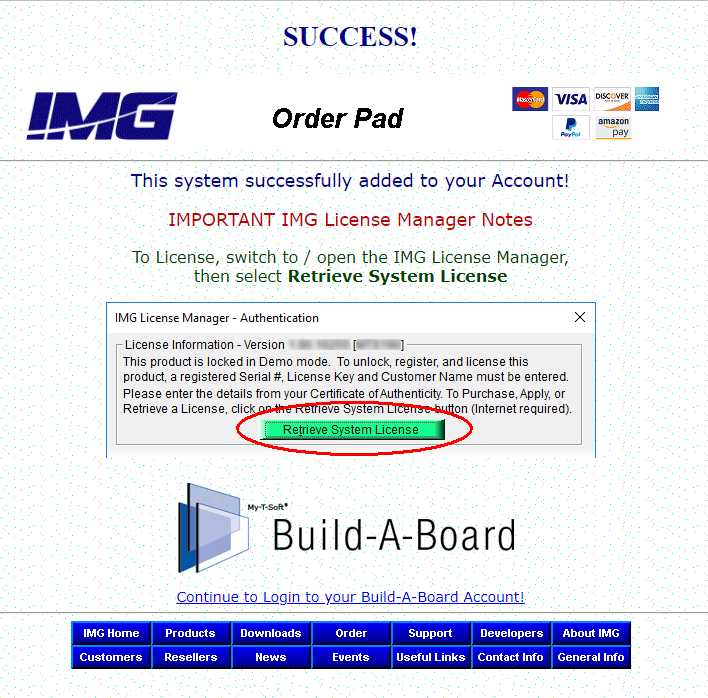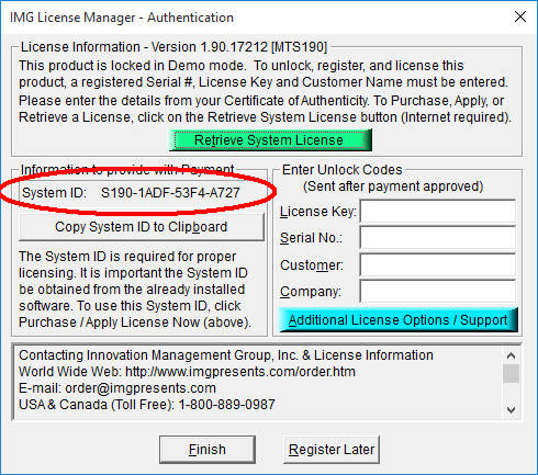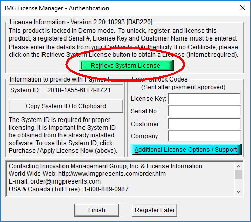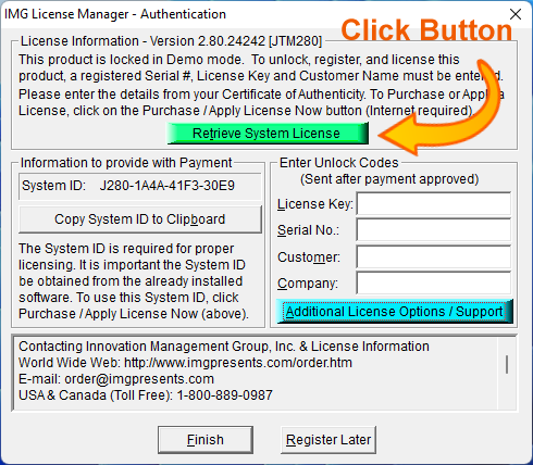 To license My-T-Soft, select "System License Options", then click on "Retrieve System License"