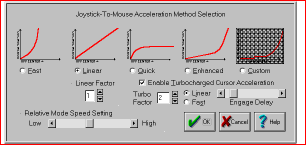 When Cursor Acceleration is Enabled, you may select from one of five Acceleration Methods. The Custom Method allows you to create your own Acceleration Curve. Refer to Joystick-To-Mouse Notes for more details. The Turbocharged Cursor Acceleration enables true acceleration, but controls over of its effects have been provided. All of these options were included to allow a great deal of user control as to how the joystick performs & how its motion affects the cursor motion. With patience & testing, the ideal performance required to suit your needs can be achieved.