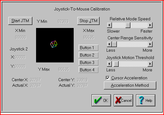 The Joystick-To-Mouse Custom Calibration Screen does not affect the physical calibration of the Joystick in any way. It does not replace the Standard Windows Calibration Method. It allows troubleshooting, technical support assistance, and Advanced users a way to customize various Joystick-To-Mouse settings to improve the Joystick "Feel" as it controls the cursor.