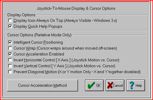If this option is On, Joystick-To-Mouse will position the mouse cursor to the default button when Dialog Boxes are opened. You may find this speeds up your tasks if you always accept the default actions.