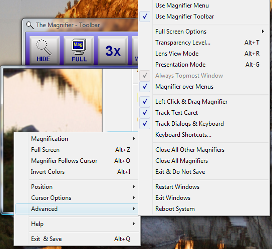 Use Magnifier Menu This option will allow you to use The Magnifier's window instead of a standard menu when you right-click on The Magnifier's window. This menu has large type, and fills the screen - see Magnifier Menu for more details.
