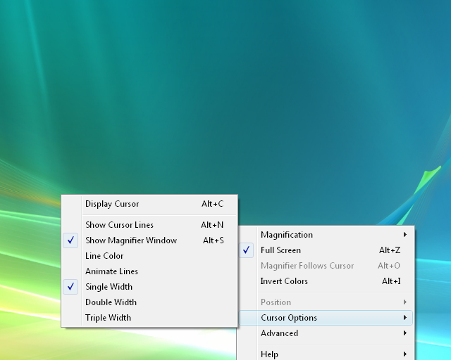 IMPORTANT NOTE: When operating in the Full Screen mode, if the cursor is displayed, you will see 2 cursors - the system cursor and the magnified cursor displayed in The Magnifier. Depending on your system capabilities, there may be a noticeable separation between the 2 cursor images at times. You can turn off the Display Cursor option in this menu, or use the Alt-C keyboard shortcut. You may also control the system mouse cursor display in the Mouse Properties (available from the Control Panel).