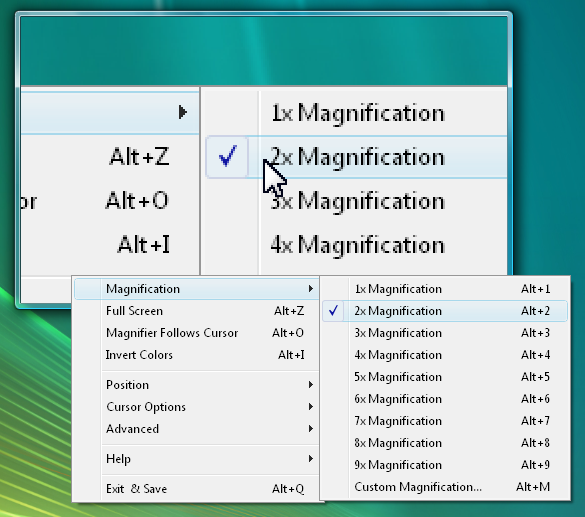 2x Magnification This selection will allow The Magnifier to show the images on your screen twice as large as they would normally appear.Keyboard Shortcut: Alt-2