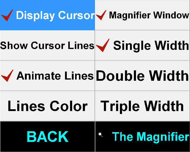 Cursor Options Menu The Cursor Options menu allows you to select cursor lines and display options. See Windowed Operation or Full Screen Operation.