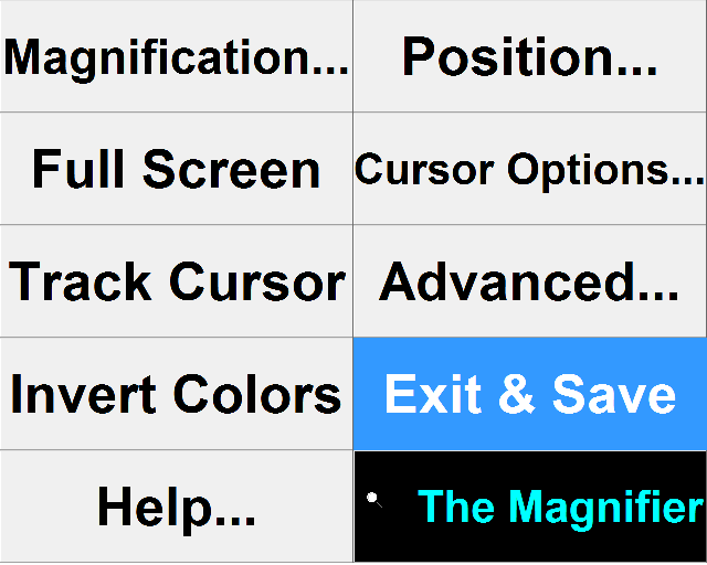 The Magnifier provides 2 menu modes. There is a special Magnifier Menu (which uses your whole screen for the menuing and uses very large text), and the standard Windows menu system. This chapter provides a reference for the full screen Magnifier Menu.