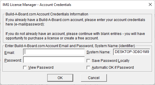 If already have a Build-A-Board.com account, simply enter your existing account credentials with e-mail and password. By default, the password is obscured - to see in plain text, check on the View Password option. The password is not saved locally, and would need to be re-entered if system is unable to retrieve a valid license. If you check on the Save Password Locally, the entered password will be saved, and used to populate the field. Note the password is saved in an encrypted form (not plain text). If there is a saved password, and you wish to bypass this Account Credentials dialog, the Automatic OK if Password when checked on will skip the display of the dialog, and automatically retrieve a license based on the e-mail/password credentials provided. For automation options, see below.