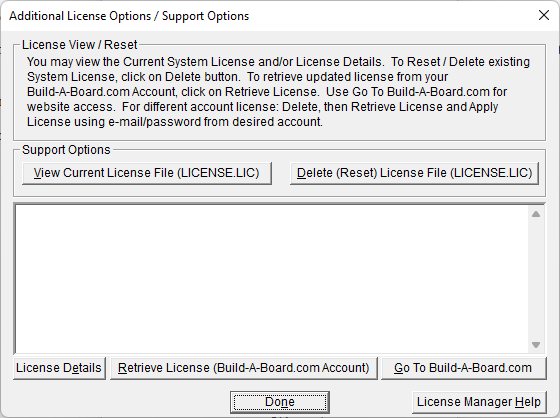 Use "Retrieve License (Build-A-Board.com Account)" to reload and obtain the current license from your Build-A-Board.com account. This could be necessary if you've added a platform license, purchased a license while operating on an evaluation license, added a serial number and been advised to renew your license, or other license change that requires a refresh/renew from the current license available tied to the current Build-A-Board.com account. Note that if you need a license from a different Build-A-Board.com account, you must Delete / Reset the license, and Apply the license to the current system with your e-mail/password from the correct Build-A-Board.com account.