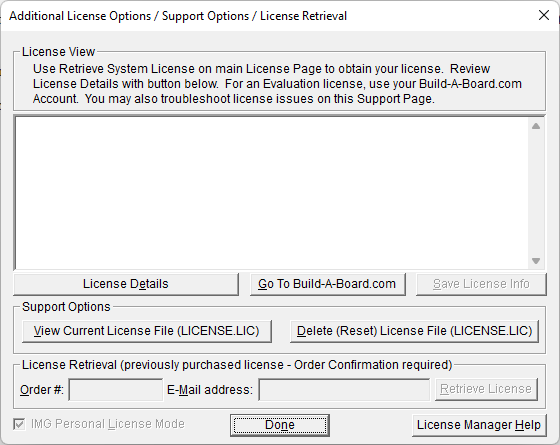 The IMG License Manager will operate with an IMG Personal License (Basic/Standard/Professional). This is a system based license that can license any supported IMG product per platform. Licensing is done through the internet and your Build-A-Board.com account, accessed via the "Retrieve System License" button.