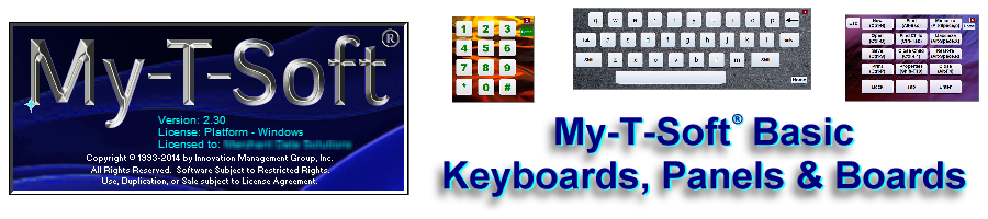My-T-Soft® BasicVirtual Keyboards, Button Panels & Key Padsfor Mobile, Rugged, Tablet, and Touch screen Computer SystemsMy-T-Soft® Basic is the Windows run-time component of IMG's Build-A-Board, which supports custom virtual on-sreen keyboards, keypanels and keypads. My-T-Soft Basic provides the program to display and operate these keyboards. When unlicensed, the Free Edition includes