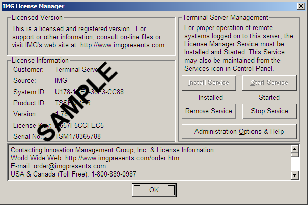 Server Note: When operating on a Server, there is an IMG License Manager Service that needs to be running for proper operation of Remote Terminals and Systems. When unlicensed, the Terminal Server Management (Demo) option provides access to Install/Remove, and Start/Stop this service. See below for more information.