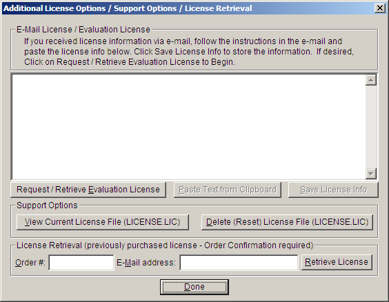 The Additional License Options section has tools and options to Enter or Paste Evaluation or Other License Information; Request and Retrieve Evaluation Licenses; Support Options to View and Delete (Reset) the License file; and a mechanism to retrieve a Purchased License by entering the Order Confirmation Number and the Order E-mail address.