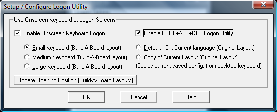If you do not have Build-A-Board, and wish to change the opening position of the Small/Medium/Large Build-A-Board layouts, there is a basic utility called KBFLOGON.EXE in the LOGON folder. You can access this by clicking on Update Opening Position (Build-A-Board Layouts). By running this utility, you can change the opening X / Y position of the current selected Build-A-Board layout to match your screen orientation & resolution.