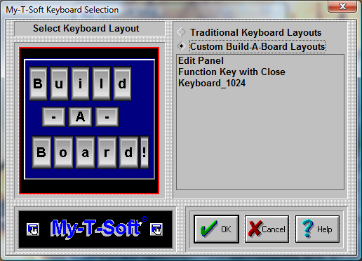 There are a few sample, custom Build-A-Board Layouts available. Additional Build-A-Board layouts can be created, and when placed in the Installation Folder will be added to this list. When selected, the KEYBOARD.KBF in the users configuration folder is replaced with the selected layout. When My-T-Soft TS is run, the layout is recognized, and the Build-A-Board compatible run-time (MYTSOFT2.EXE) is used to operate with the version 2.x keyboard layouts.