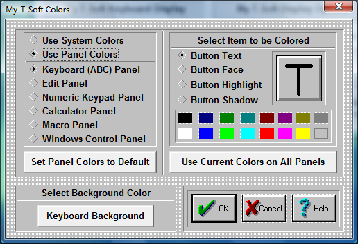 Select "Use Panel Colors" to use My-T-Soft TS Colors. My-T-Soft TS colors allows you to customize My-T-Soft TS by coloring each panel's keys and buttons.