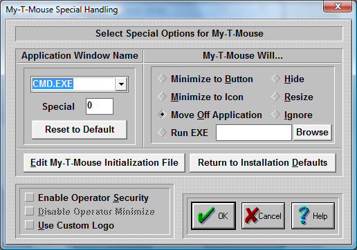The ability to Run an Executable file adds great flexibility, and should be used in conjunction with the My-T-Mouse Developers Kit. The executable file is run once until another executable is launched via My-T-Mouse (typically when some other window becomes active that is in the Special Handling list). Primarily this is meant to be used to position or reconfigure My-T-Mouse as different windows become active (different web pages, different applications, etc.). My-T-Mouse only checks the Active window when it is open normally (NOT as an Icon or Button). Also, the React to Dialog and other Windows in Operation Options can override these settings.