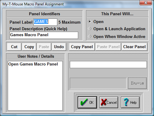 Click on this Radio-Button if you want to assign an application to this Macro Panel. Enter the application name and path in the edit box below (Application), or press Browse to select an application. You may also enter a Working Directory that will become the current directory when the Application is launched. When accessed, the panel will open & then automatically launch the application.