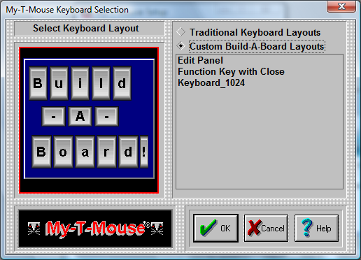 There are a few sample, custom Build-A-Board Layouts available. Additional Build-A-Board layouts can be created, and when placed in the Installation Folder will be added to this list. When selected, the KEYBOARD.KBF in the users configuration folder is replaced with the selected layout. When My-T-Mouse is run, the layout is recognized, and the Build-A-Board compatible run-time (MYTSOFT2.EXE) is used to operate with the version 2.x keyboard layouts.
