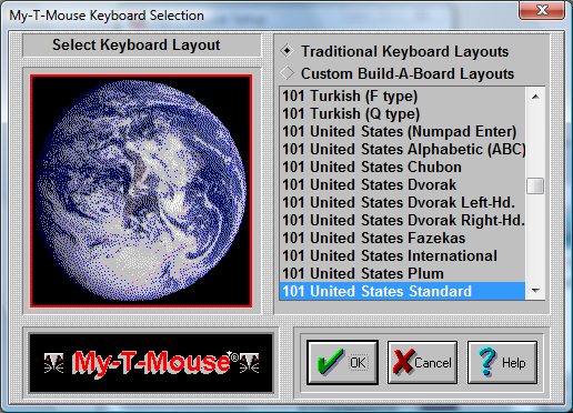 My-T-Mouse can operate with many different keyboard layouts. By selecting the same keyboard layout that Windows uses, you can synchronize the display on My-T-Mouse with the characters generated in your application.
