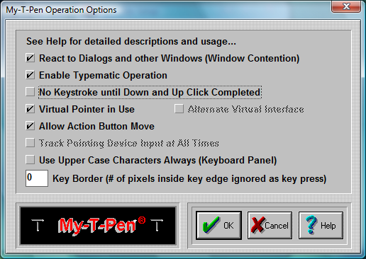 This setting should be set On if a the device used to move the mouse cursor (pointer) is not a standard mouse, or trackball. Any hardware device that interacts via a "device driver" with Windows should not be considered a Virtual Pointer (unless the implementation does not fully emulate a standard mouse [which is more common than otherwise]). Various Assistive Technology devices such as cameras or lasers that track the eye, other biometric sensors, or other software based translation interfaces (such as the MouseKeys in Microsoft's Accessibilities options) when used should have the Virtual Pointer setting On. This feature forces My-T-Pen to operate slightly differently for "Clicks" (button down, button up), and during moving the My-T-Pen window.