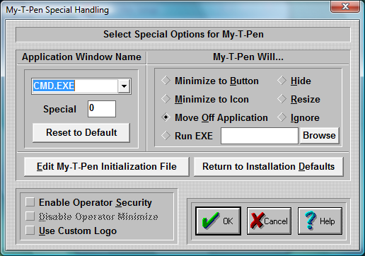 The ability to Run an Executable file adds great flexibility, and should be used in conjunction with the My-T-Pen Developers Kit. The executable file is run once until another executable is launched via My-T-Pen (typically when some other window becomes active that is in the Special Handling list). Primarily this is meant to be used to position or reconfigure My-T-Pen as different windows become active (different web pages, different applications, etc.). My-T-Pen only checks the Active window when it is open normally (NOT as an Icon or Button). Also, the React to Dialog and other Windows in Operation Options can override these settings.