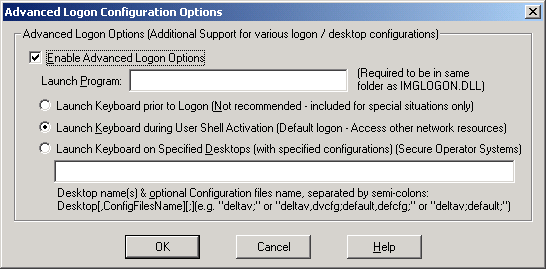 The Launch Keyboard during User Shell Activation option runs the Launch Program during the User Shell activation after a successful logon of the user-name/password/domain combination. This guarantees that the keyboard executable is available during any additional password prompts (or other text input situations) created by programs being loaded during this phase, but prior to the full user desktop display (& StartUp programs being executed). This is the most common situation where these Advanced Logon Configuration Options are required.