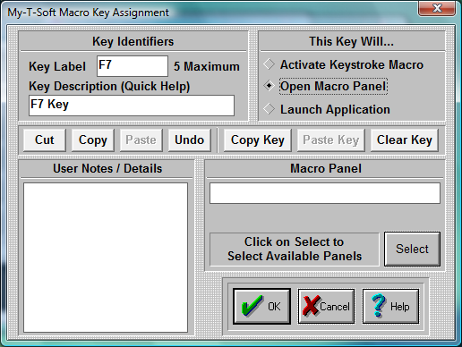 These shortcut keys may be used to manipulate & operate within My-T-Soft Setup / Macro Key Editing. For example, you could Copy Key information from an existing panel to be pasted into another Macro Panel.