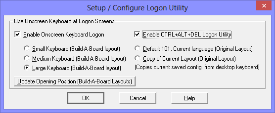 If you do not have Build-A-Board, and wish to change the opening position of the Small/Medium/Large Build-A-Board layouts, there is a basic utility called KBFLOGON.EXE in the LOGON folder. You can access this by clicking on Update Opening Position (Build-A-Board Layouts). By running this utility, you can change the opening X / Y position of the current selected Build-A-Board layout to match your screen orientation & resolution.