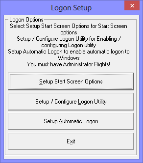 Setup / Configure Logon Utility enables options prior to running My-T-Soft after the user has logged onto the system. There are various security options that can affect the way the system is used, and this allows the keyboard to be available at secured screens, along with a way to generate a Ctrl-Alt-Delete option when a system is secured with this requirement.