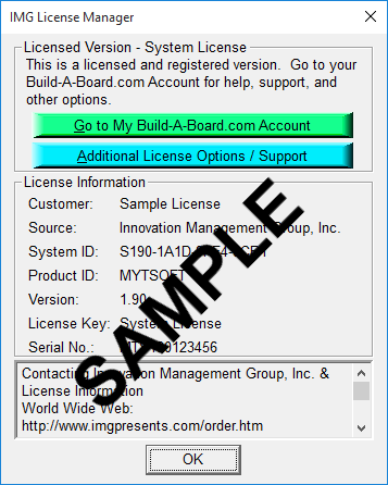 To quickly and easily license the software (on a system that has internet access), simply click on the "Retrieve System License" button. Once connected to IMG's website, you can use your existing Build-A-Board.com account, or you can select the type of License you wish to purchase. Once paid, your order will be processed, and you will receive a confirmation e-mail and a separate e-mail with license information. Once the order is fully processed, you can then click the "Retrieve System License" button to automatically license your system.