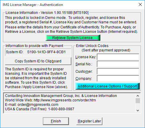 In order to License My-T-Soft, the correct License Key and Serial Number must be entered into the IMG License Manager, along with some text for the Customer (and optional Company) text areas. The License Key and Serial Number can be found on the Certificate of Authenticity, or in the Software Unlock Codes e-mail.