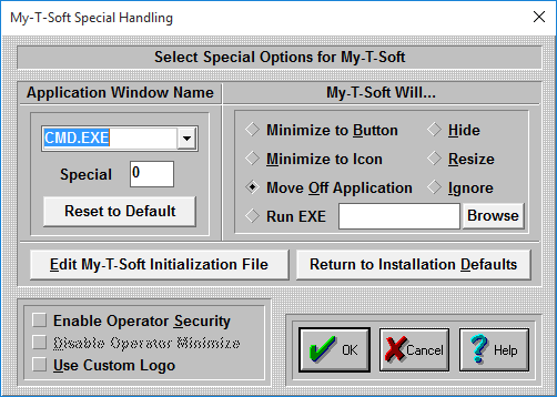 The ability to Run an Executable file adds great flexibility, and should be used in conjunction with the My-T-Soft Developers Kit. The executable file is run once until another executable is launched via My-T-Soft (typically when some other window becomes active that is in the Special Handling list). Primarily this is meant to be used to position or reconfigure My-T-Soft as different windows become active (different web pages, different applications, etc.). My-T-Soft only checks the Active window when it is open normally (NOT as an Icon or Button). Also, the React to Dialog and other Windows in Operation Options can override these settings.