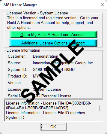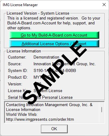 To quickly and easily license the software (on a system that has internet access), simply click on the "Retrieve System License" button. Once connected to IMG's website, you can use your existing Build-A-Board.com account, or you can select the type of License you wish to purchase. Once paid, your order will be processed, and you will receive a confirmation e-mail and a separate e-mail with license information. Once the order is fully processed, you can then click the "Retrieve System License" button to automatically license your system.