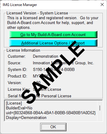 When properly Licensed with an IMG Personal License, a screen similar to this will show the License Information for the product. This display indicates that the software is Licensed. For help, support, and other options, you can click on the "Go to My Build-A-Board.com Account" to open a browser and access your account online.