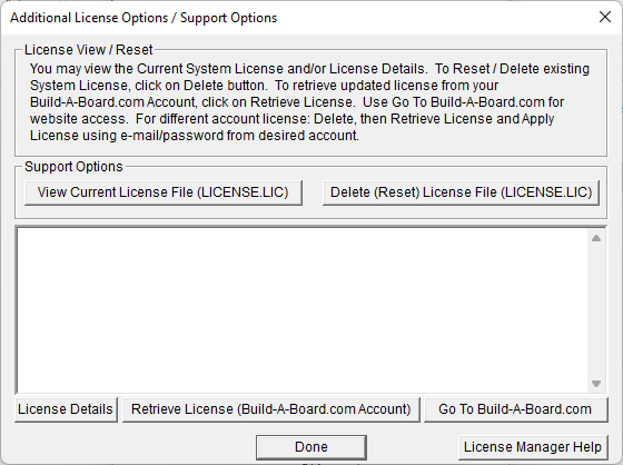 Note: The "Retrieve System License" uses a unique identifier to automatically license your system (which is only sent if the license is added or purchased after using the "Retrieve System License" button). If you try this on a different system, or after a system update or re-install (or after a change to this unique ID), the software will not license automatically. You will either need to add the system to your existing Build-A-Board.com account or purchase the appropriate license.