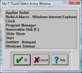 This list shows all of the current active windows running on your system. You may select the Window Name from the list. You may wish to modify the name to remove any open documents, or other information that may change. My-T-Touch must have an exact match to recognize the need to automatically open the Macro Panel.