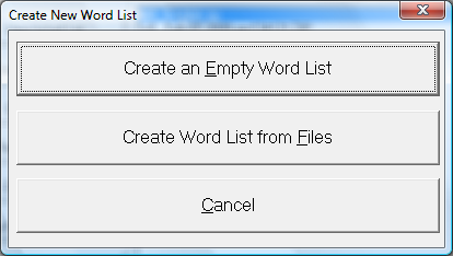 You can create an empty word list, or create a new wordlist from existing files. You will be asked to name the word list. Simply enter the new name (the WL_ prefix and .ZIP extension will be automatically entered). If you select the "from Files" option, you can then select one or more files to use. Depending on your situation, it may be easier to manage many word list files separately, and then merge them to make a final version. Once you are happy with your current word list, you can return to the Word List Assistant, select your most recent word list, and rename (or copy) it to a newly named word list.