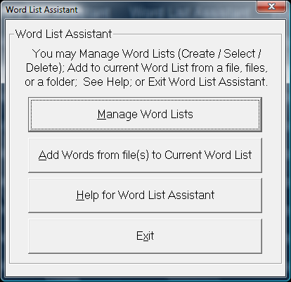 Hints: Your current Word List will ALWAYS be saved when you enter Manage Word Lists. If the Word List Assistant is used often, this will create many word list files - however, it is easy to select many files (click & drag), then use the Delete Selected option to clear out any unwanted word list files. This automatic approach preserves word lists as snapshots in time, which may be useful if manipulating word lists using the Word List Assistant.