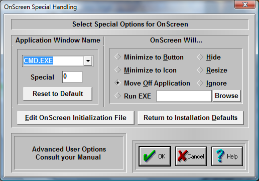 The ability to Run an Executable file adds great flexibility, and should be used in conjunction with the OnScreen Developers Kit. The executable file is run once until another executable is launched via OnScreen (typically when some other window becomes active that is in the Special Handling list). Primarily this is meant to be used to position or reconfigure OnScreen as different windows become active (different web pages, different applications, etc.). OnScreen only checks the Active window when it is open normally (NOT as an Icon or Button). Also, the React to Dialog and other Windows in Operation Options can override these settings.