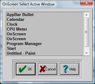 This list shows all of the current active windows running on your system. You may select the Window Name from the list. You may wish to modify the name to remove any open documents, or other information that may change. OnScreen must have an exact match to recognize the need to automatically open the Macro Panel.