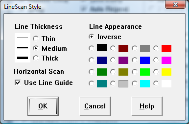 The appearance of the line used in LineScan may be Inverse (the exact opposite color of what the line is 'over' - for example, the opposite of white is black, the opposite of red is green, etc.), Black (solid), White (solid), or any of the standard colors available on a 16 color display (Dark & Light Gray, Red, Green, Blue, etc.). You should try each of them to decide which you prefer.