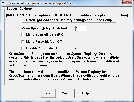 Support Settings contains options for Advanced CrossScanner / Windows users. For most users, there is no need to modify any of these settings. Please refer to the help on each item before changing any setting. For technical details on some of these settings, you may wish to review the Advanced Notes.