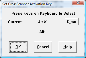 The Activation key is used to toggle CrossScanner from an active mode (awake), to an inactive mode (sleeping) while CrossScanner is running within Windows. Within Setup, you may select the Activation Key (or combination of keys) used to Activate/De-Activate CrossScanner. You may use keys F1 through F12, 0 through 9, and A through Z, by themselves, or in any combination with Ctrl, Shift, and/or Alt. Make sure CrossScanner is not running when you select the Activation Key.