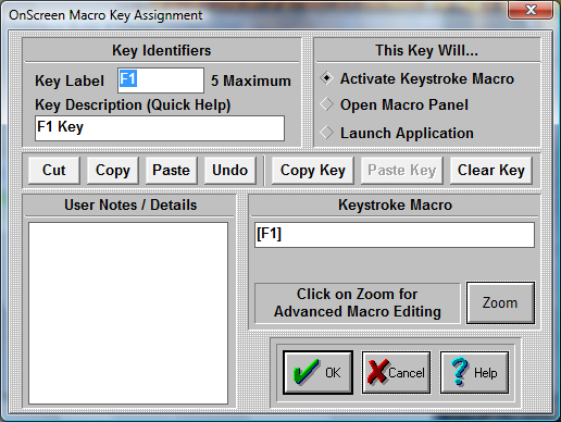 Enter a key label. This label will appear on the key in the Macro Panel. Enter a key description. The key description will appear in the Quick Help bar.