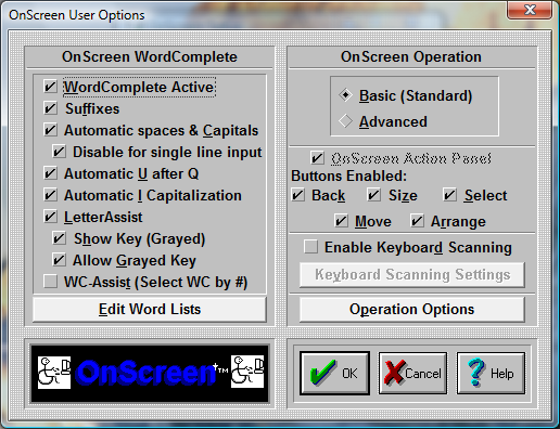 By selecting WordComplete Active with the Check-Button, you open the WordComplete Panel, and you activate its operation within OnScreen. When Active, Suffixes, Automatic spaces & Capitals, Automatic U after Q, Automatic I Capitalization, and Edit Word Lists Button become available.