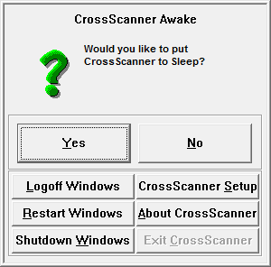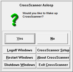 CrossScanner may be toggled to Sleep (Off), or Awake (On) by clicking on the CrossScanner icon on the taskbar. Also, you can quickly get at the following options by clicking on the CrossScanner Icon: Logoff Windows, Restart Windows, Shutdown Windows, CrossScanner Setup. IMPORTANT NOTE: While using CrossScanner, always save all documents and close all applications prior to logoff, restart, or shutdown! There is also an About Information button, and you may Exit CrossScanner when CrossScanner is Off.