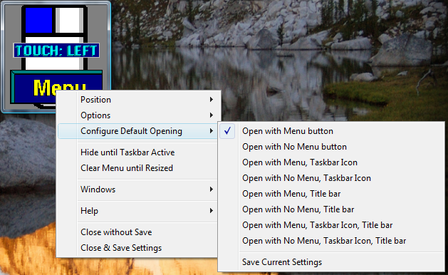 Selecting Configure Default Opening displays another menu where you can determine the opening configuration (e.g. how TouchRight Utilities opens when started). There are 8 combinations, along with a Save Current Settings Option. Whenever a specific combination is selected, its configuration settings will be saved immediately. To test the configuration settings, use the Close without save option on the main menu.