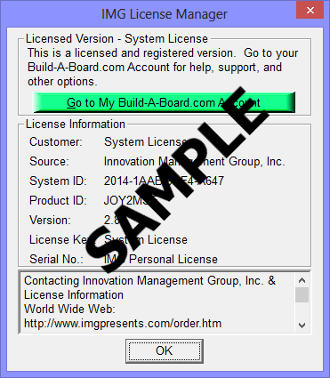 When properly Licensed with an IMG Personal License, a screen similar to this will show the License Information for the product. This display indicates that the software is Licensed. For help, support, and other options, you can click on the "Go to My Build-A-Board.com Account" to open a browser and access your account online.